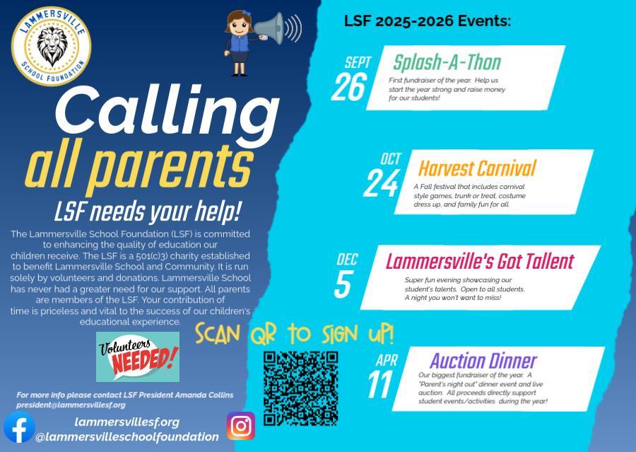 We are looking for parents to fill committee spots for each event. If we don't get enough parent volunteers we may have to cancel events. If you would like to know more information on how to get involved contact the school office or email the LSF team.